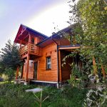 Dom z bali z poddaszem użytkowym i garażem jednostanowiskowym.